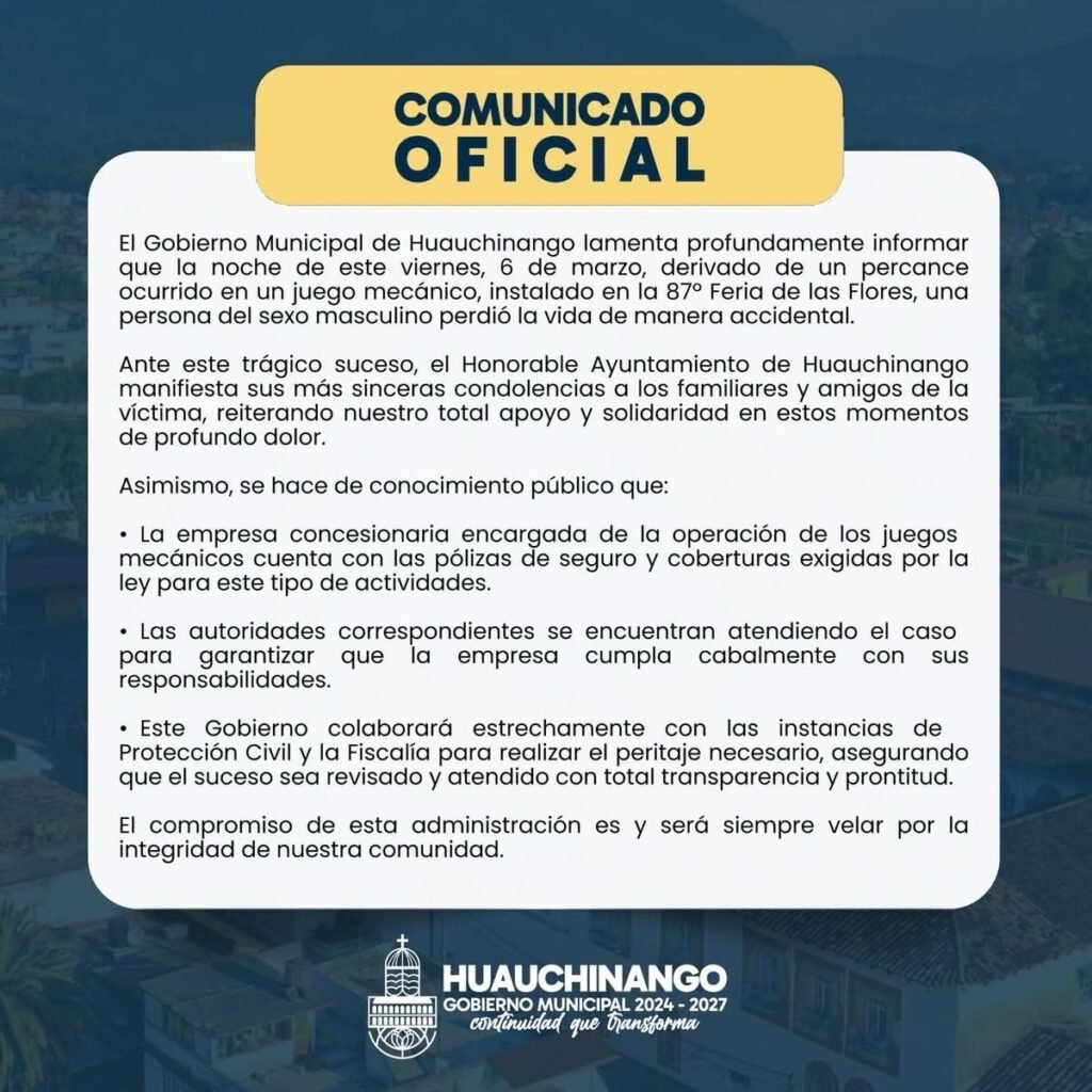 Posteriormente, el Gobierno Municipal de Huauchinango emitió un comunicado en el que informó que el fallecimiento ocurrió de manera accidental durante la noche del viernes 6 de marzo, en el marco de la edición número 87 de la Feria de las Flores.