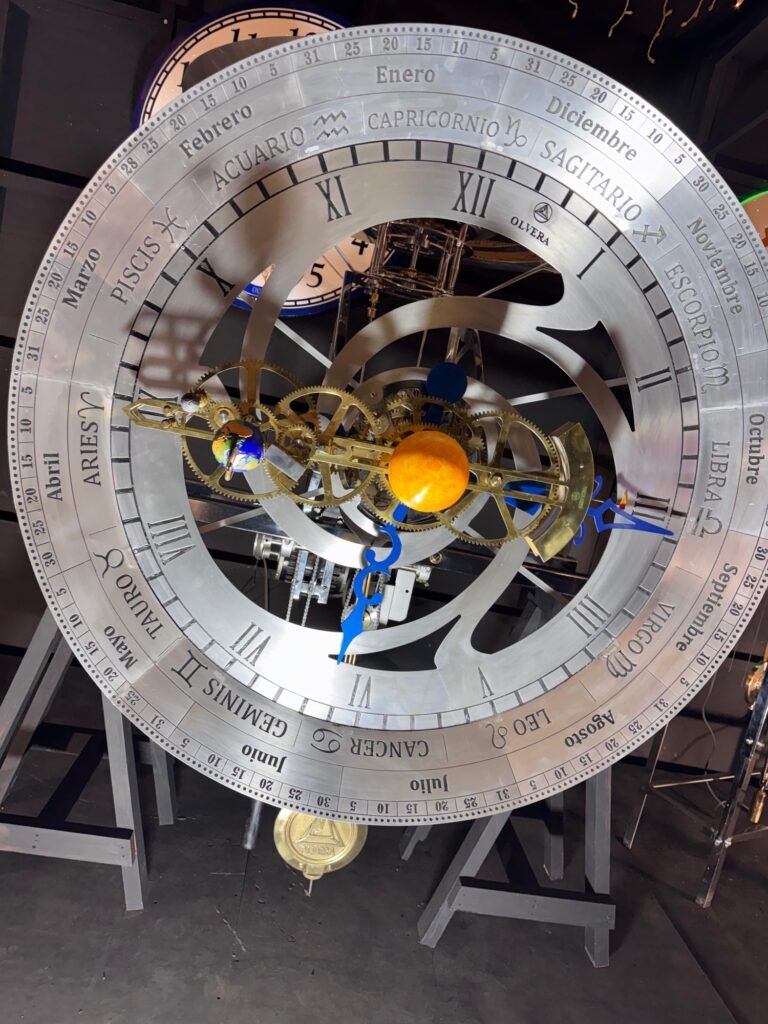 Por su parte, la marca Olvera exhibe nueve piezas de gran complejidad, entre ellas un reloj astronómico con dos carátulas en forma de galaxias espirales. Este reloj muestra la hora, la fecha, las fases lunares basadas en un ciclo de 29.5 días y las constelaciones del zodiaco. Además, incorpora detalles como la inclinación real de la Tierra y su rotación en el sistema solar, junto con una manecilla fechadora que completa una rotación durante los 365 días del año.